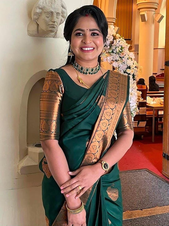 - Green and gold-toned banarasi saree