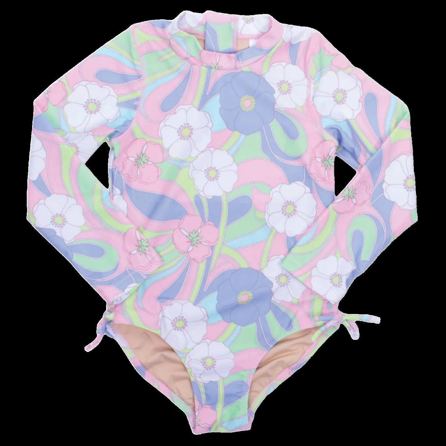 Groovy Daisy Swirl Girls One Piece Long Sleeve Swimsuit