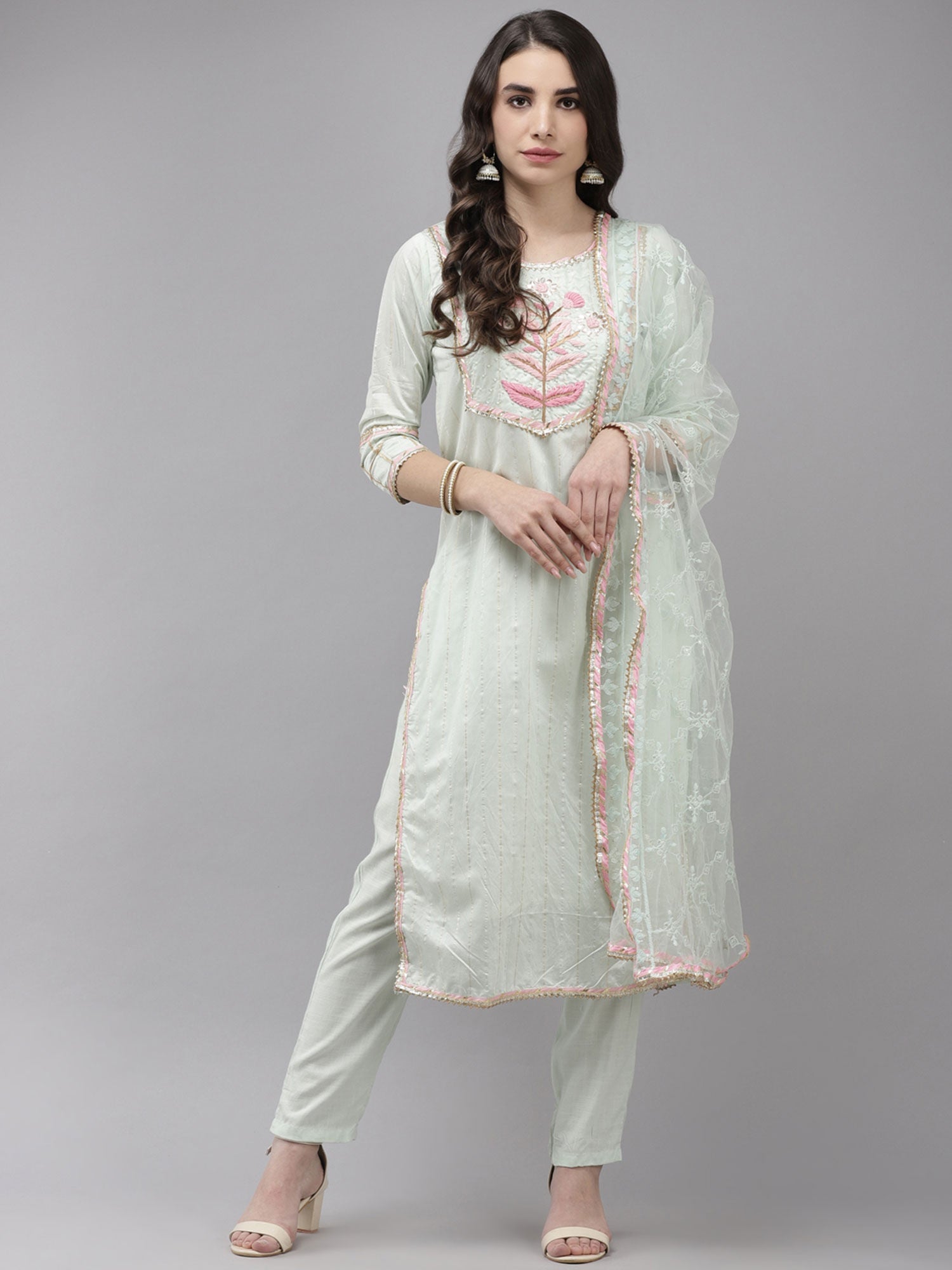 ISHIN womens Chanderi Silk Green Embroidered A-line Kurta Trouser Dupatta (Set of 3)