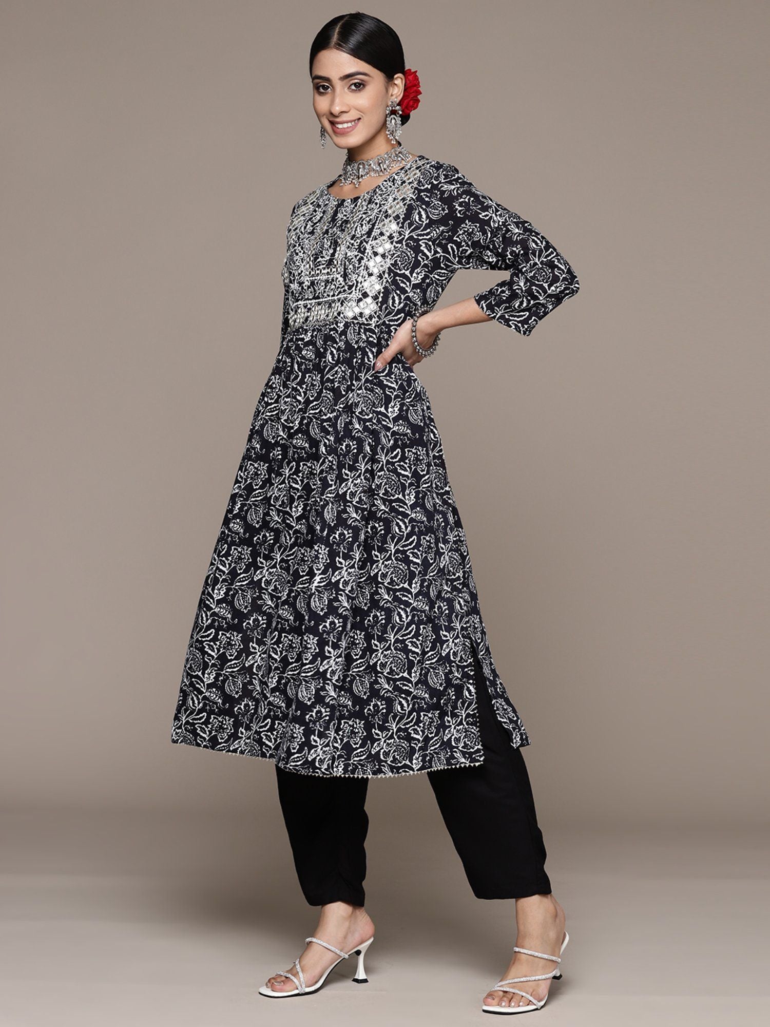 - Unleash the charm of the Ishin Women's Printed Black A-Line Kurta Suit Set with Trousers, showcasing exquisite mirror work for a touch of glamour.