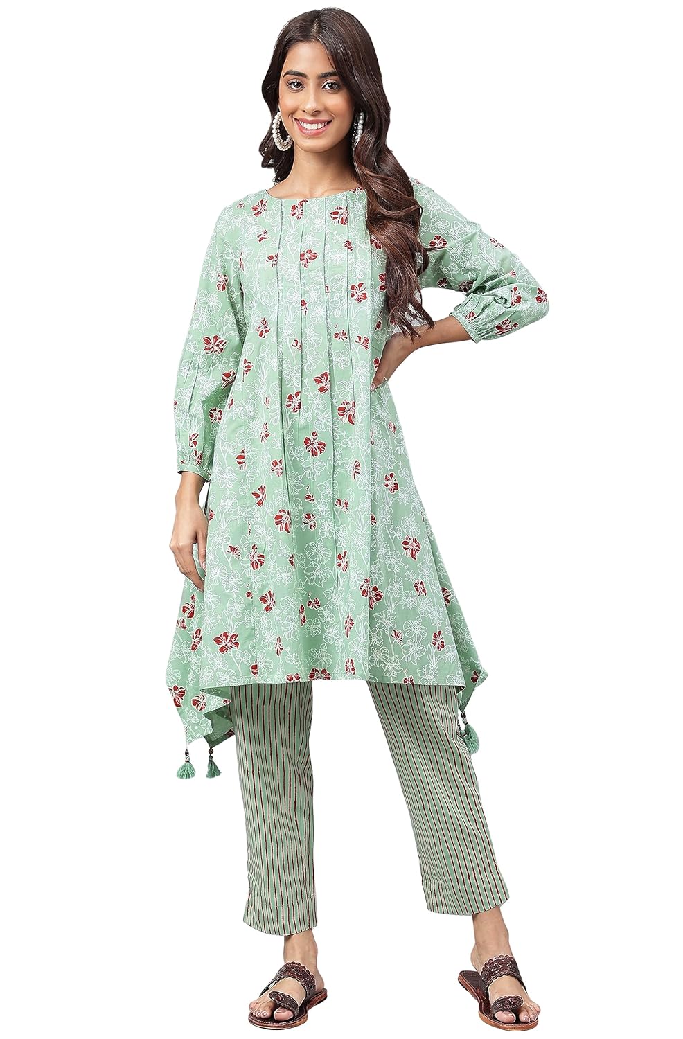 Janasya Women's Green Cotton Floral Printed Kurta with Pant