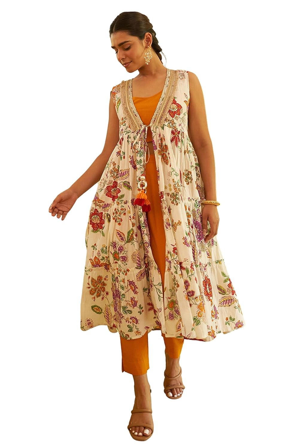 - Elevate your festive look with this stylish and comfortable Cotton Crop Top, Pant, and Jacket set.The set includes a Crop Top, Pant, and Jacket, offering a complete and coordinated outfit for your special occasions.