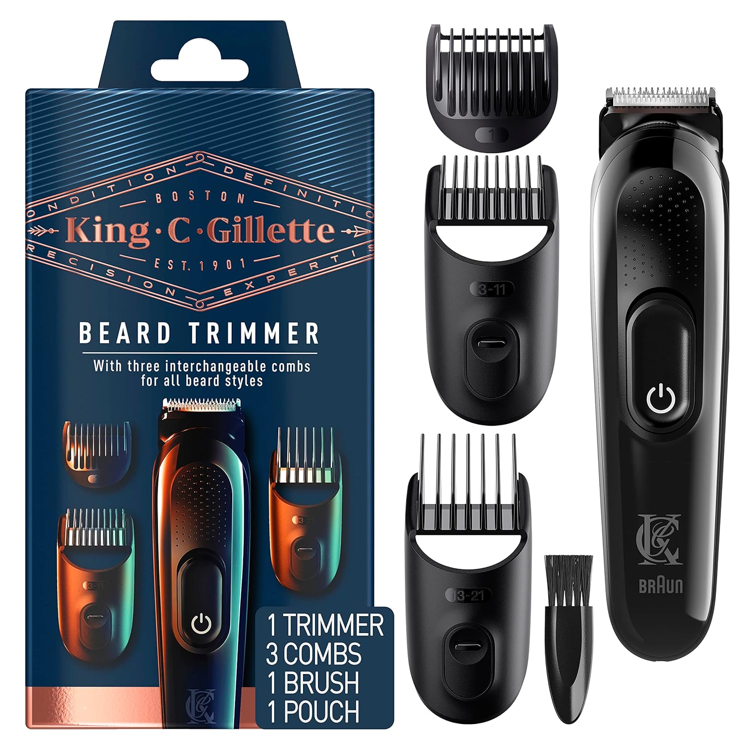 Designed for a faster, sharper, more efficient cut, the improved King C. Gillette Beard Trimmer for men is the result of a century of styling mastery, bringing you precision at every angle and every length. King C Gillette is the only range that bears the name of our company's founder: King C. Gillette. Maintaining a well-groomed beard is a craft that requires the right tools. The King C. Gillette beard care line includes a complete set of precision tools and quality beard care products, to enable every man to create his own unique style. The trimmer's long-lasting sharp blades assure barber-quality grooming results. Enjoy up to 50 minutes of quality trim time to perfect your facial hairstyle no matter where you are. This powerful cordless electric beard trimmer includes 3 easy-to-wash upgraded comb attachments for versatility on all beard styles and shapes, ranging from stubble to long. What's included: the beard trimmer box includes a Cordless Beard Trimmer, short beard comb, long beard comb, stubble comb, storage pouch, charger and cleaning brush.