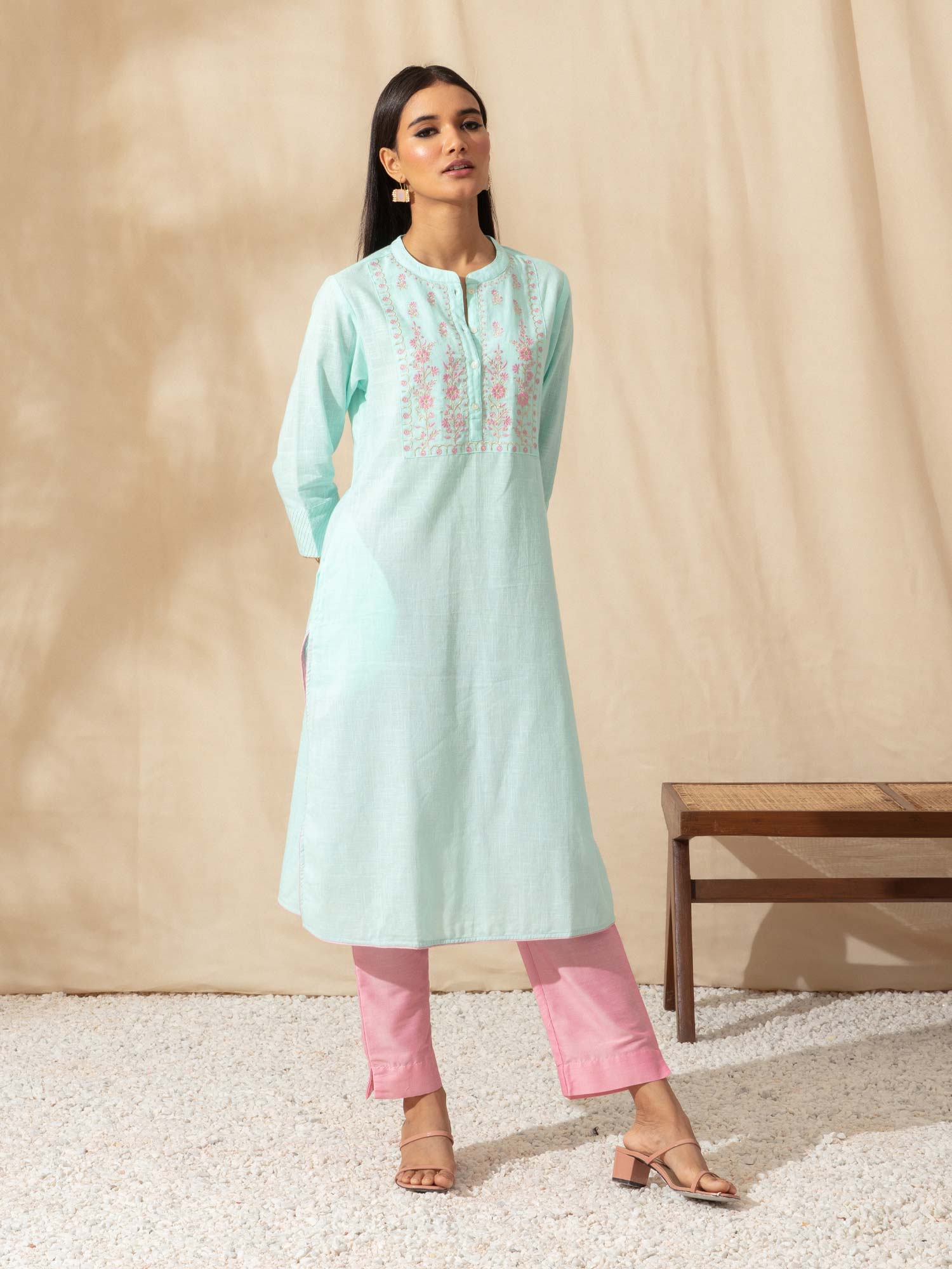 - Elevate your festive look with this aqua kurta from Likha, featuring exquisite yoke embroidery on a comfortable cotton slub fabric. Make a stunning statement at any occasion with its distinctive Mandarin neckline.