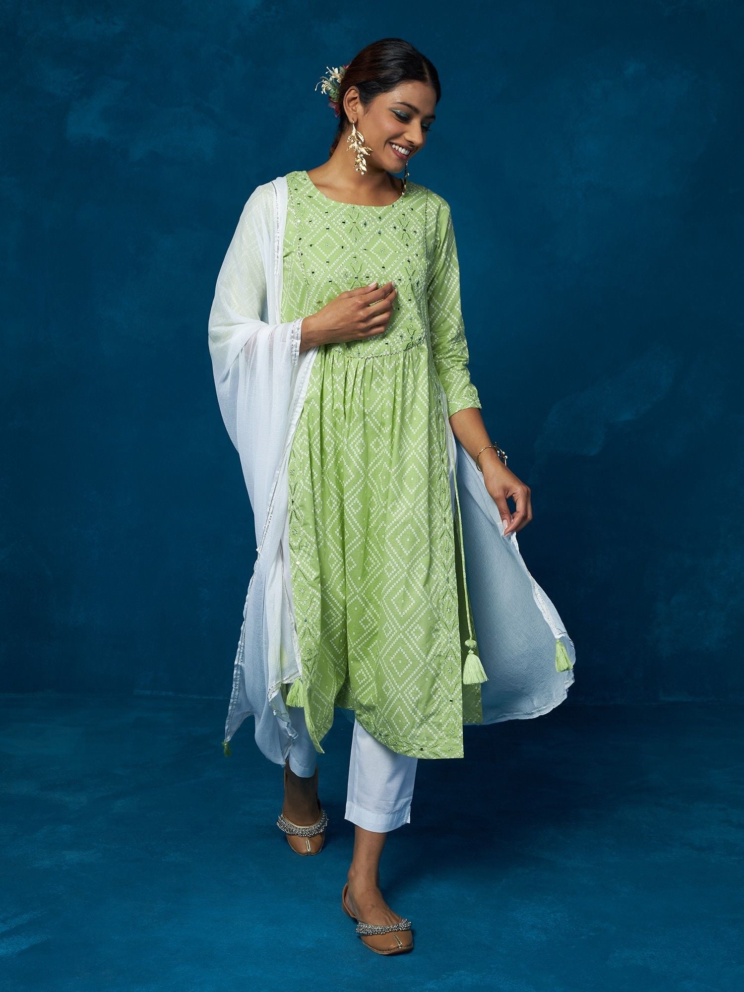 Elevate your fashion with our Mirror Work Cotton Kurta Set, a beautiful ensemble that effortlessly combines traditional mirror work with contemporary style. The set features an eye-catching printed pattern, perfect for adding a touch of grace to your look.