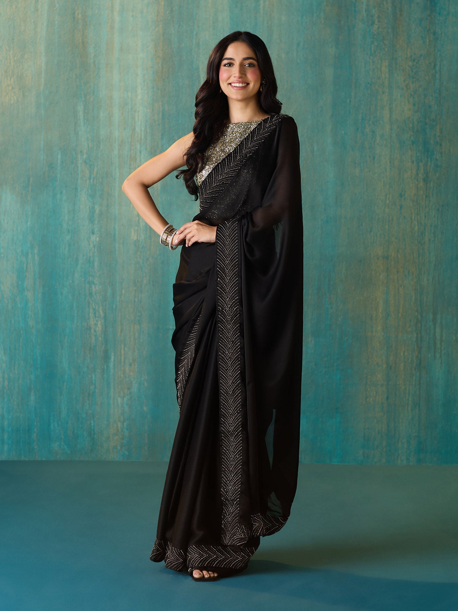 - Type of Work: Embellished & Sequined, adding an element of opulence to the saree.