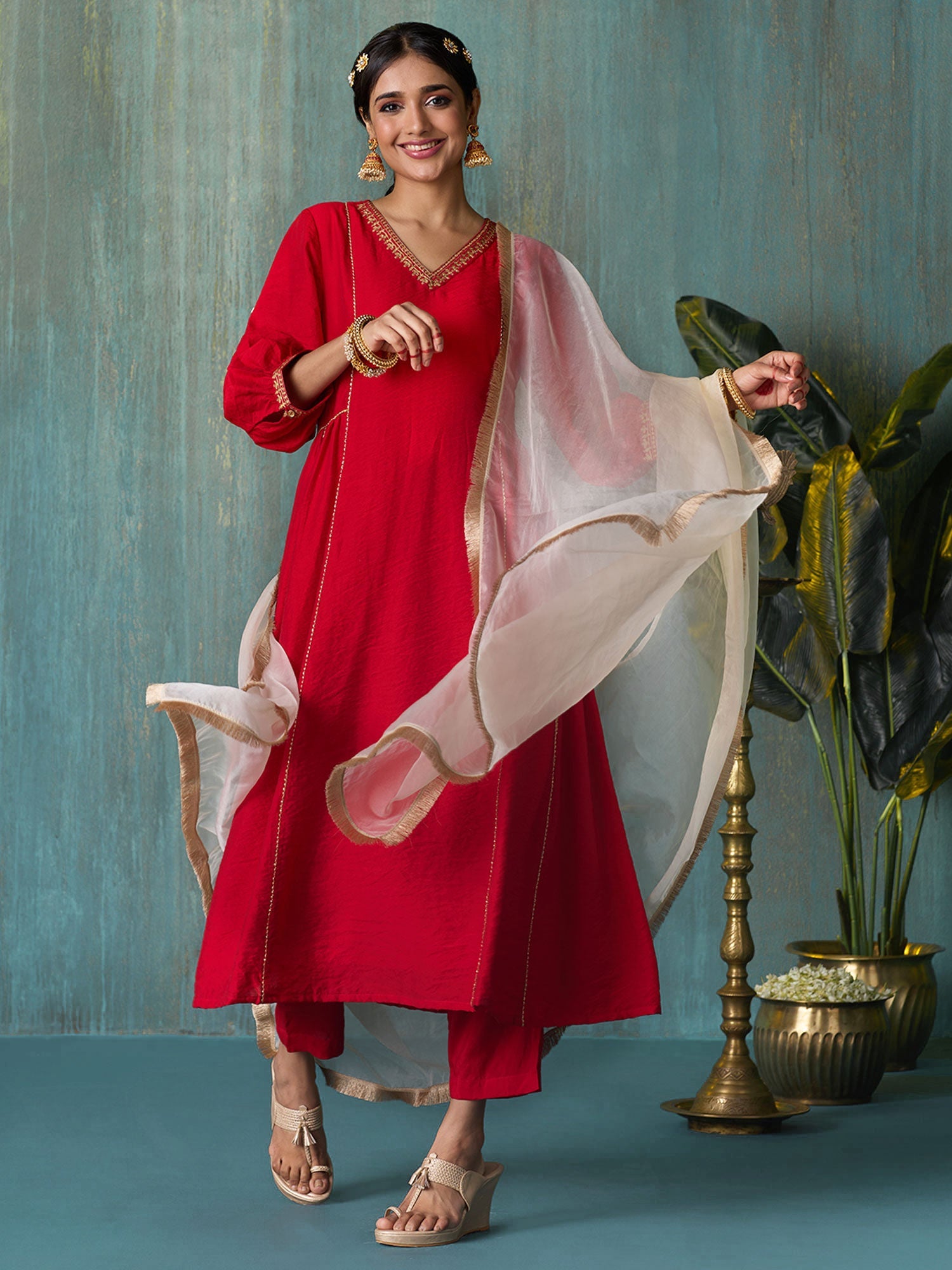 Likha Red Tyohar Viscose Chanderi Embroidered Kurta Pant & Dupatta LIKSKD273 (Set of 3)