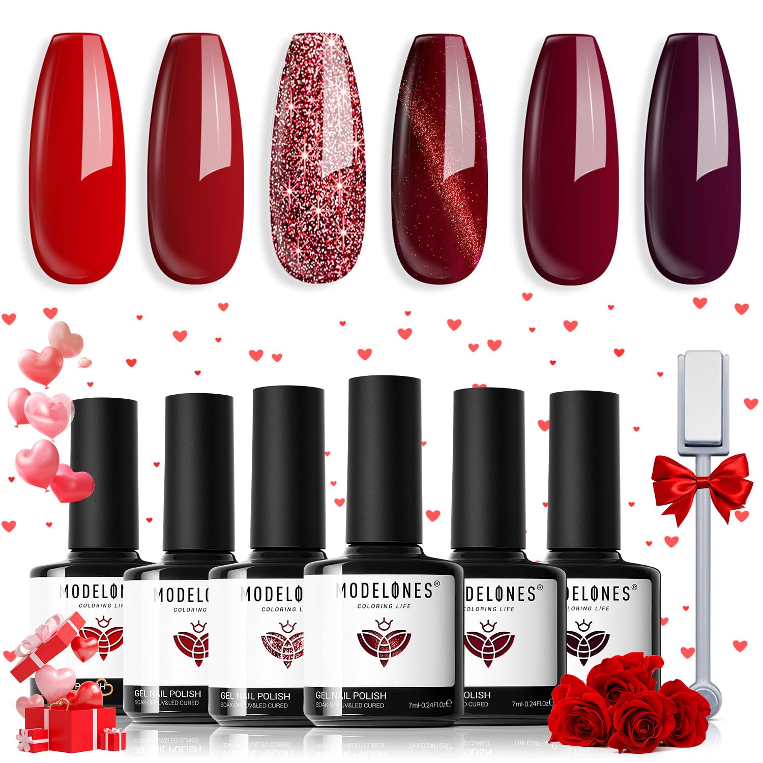 modelones Red Gel Nail Polish Set - 6 Colors Ruby Sparks Collection Popular Glitter Gel Polish Cat Eye Burgundy Red Sparkle Bloody Red Nail Polish Kit Art, DIY Home Salon Valentine's Gifts for Women