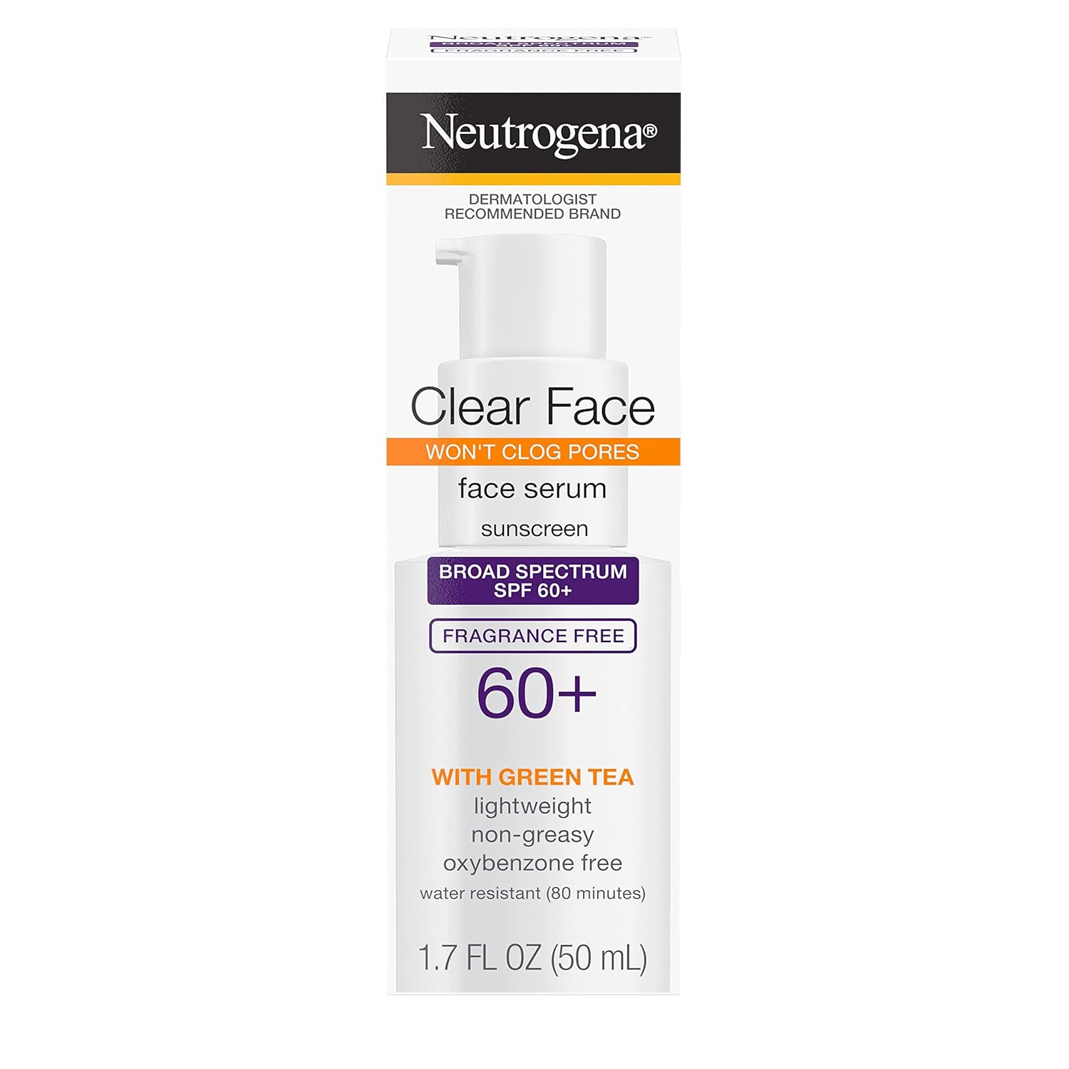 Neutrogena Clear Face Serum Sunscreen with Green Tea, Broad Spectrum SPF 60+, Non-Comedogenic Face Sunscreen for Lightweight UVA/UVB Protection, Oxybenzone- & Fragrance-Free, 1.7 fl. Oz