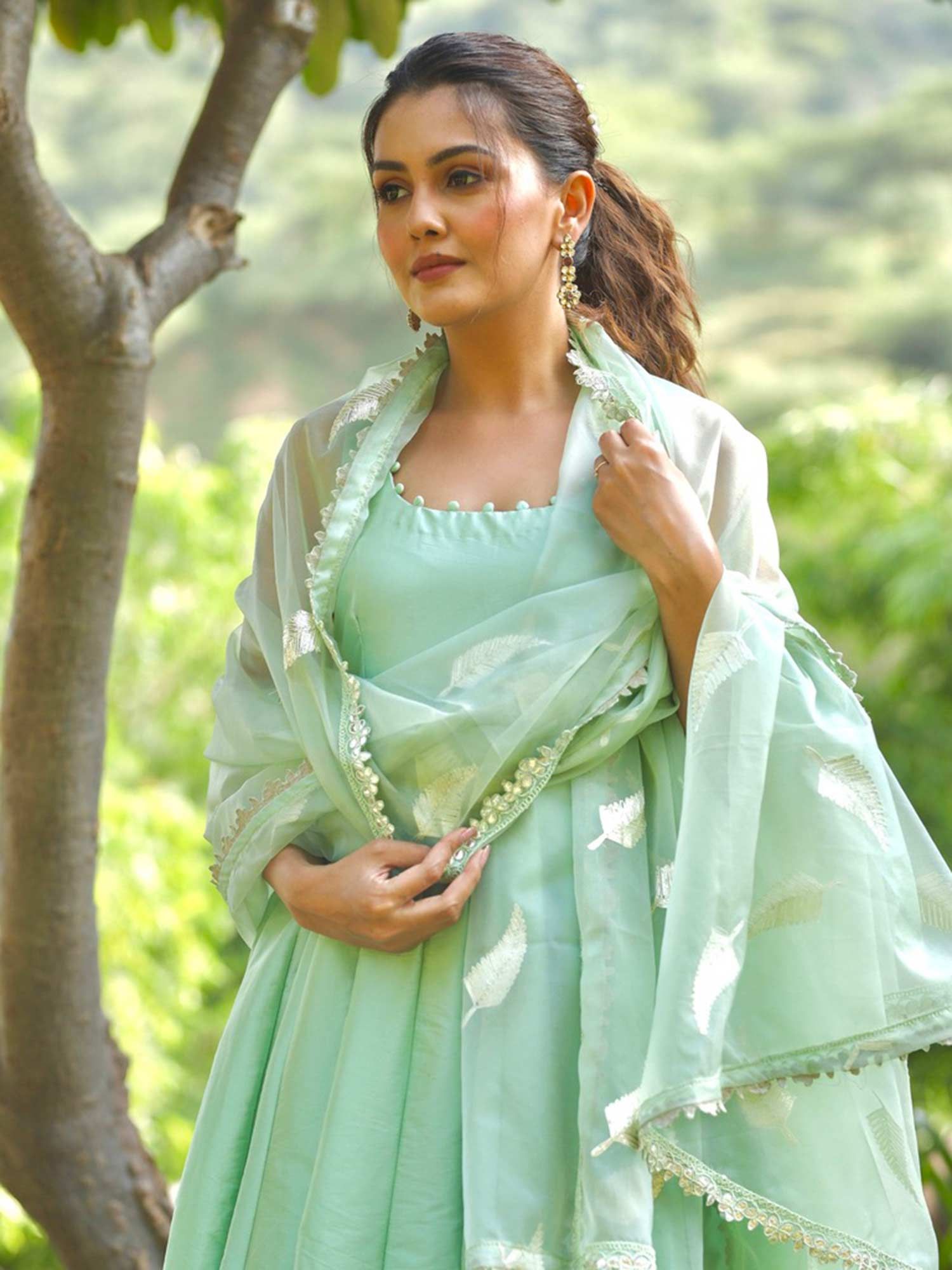 - Elevate your ethnic wardrobe with this elegant green kurta set. Crafted from luxurious silk, this set is perfect for festive occasions. The set includes a sleeveless kurta with a scoop neck, a churidar, and a dupatta, offering a complete ensemble. Add some statement jewelry and heels to complete your stunning look.