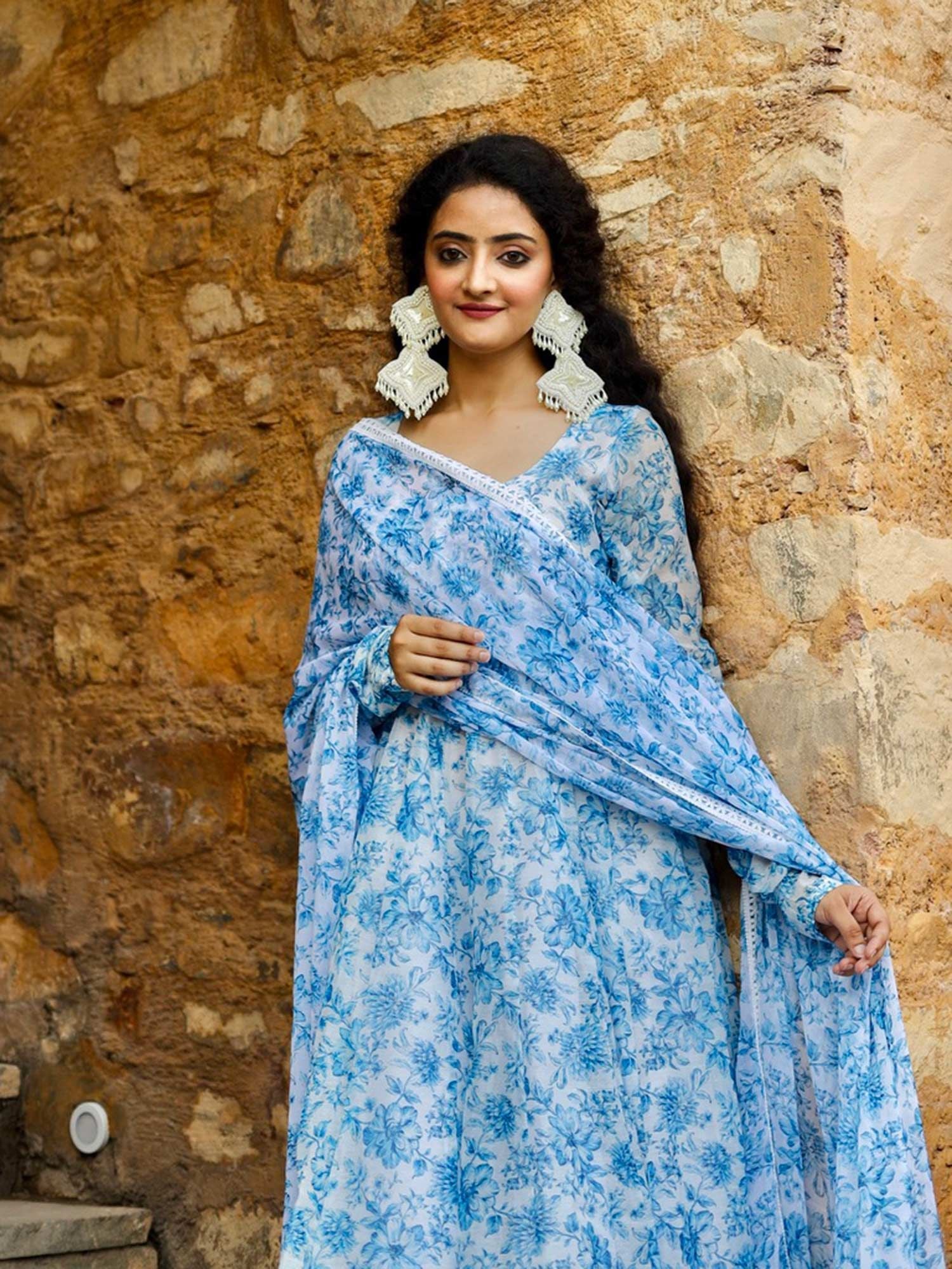 - This blue kurta set from ONEWE INDIA is graceful and stylish, perfect for any festive occasion. Made from chiffon, it's a lightweight and elegant choice.