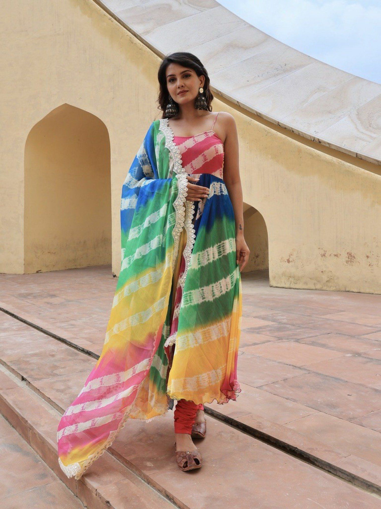 - Create a smashing effect with this pure chiffon suit set paired with a cotton silk churidar. The tie & dye pattern combined with the leheriya work on chiffon fabric looks absolutely stunning.