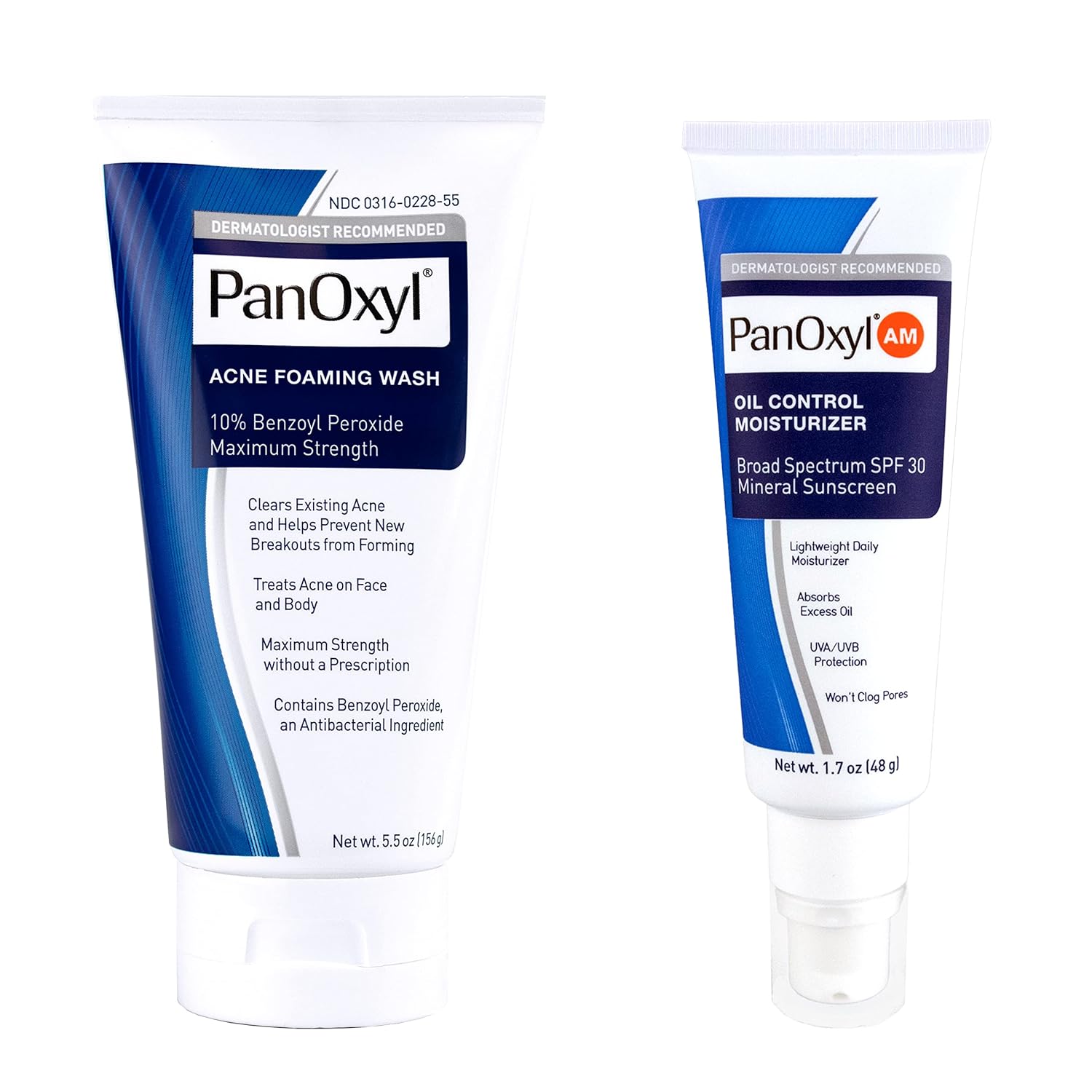 Gain control of oily, acne-prone skin with PanOxyl 10% Benzoyl Peroxide Acne Foaming Wash and Oil Control Moisturizer. This bundle makes the morning acne skincare easy by combining several steps in one. Cleanse and treat acne with PanOxyl Acne Foaming Wash. Acne is ultimately caused by three things clogging pores: dead skin cells, excess oils and acne. This powerful cleansing wash breaks the acne cycle by clearing existing breakouts and helping prevent new zits from forming. PanOxylÕs benzoyl peroxide acne wash works fast to kill acne and unclog pores. This maximum strength acne wash contains the highest concentration of dermatologist recommended benzoyl peroxide without a prescription. PanOxyl Acne Foaming Wash can be used to treat acne on the face, chest and back. To use, wet the area to be cleansed. Apply acne wash and gently massage the area for 1-2 minutes. Use at the sink or in the shower and rinse thoroughly after application for best results. Pat dry. Mattify, balance and protect oily skin with PanOxyl Oil Control Moisturizer. This all-in-one daily moisturizer absorbs excess oils and shine for a matte complexion. Excess oils are one of the main causes of breakouts, but even oily skin needs moisture to be healthy. PanOxyl Oil Control Moisturizer balances oily skin with the perfect combination of mattifying and hydrating ingredients. Hyaluronic acid seals in hydration below the surface to help skin retain moisture for all-day comfort. Antioxidants, green tea extract and caffeine provide natural benefits to nourish and support skinÕs natural defenses. This lightweight moisturizer is also non-comedogenic and wonÕt clog pores. Sun protection is a necessary step when treating acne. Some treatments can make skin vulnerable and extra sensitive to sun damage. Now, UV protection is no longer an extra step. PanOxyl Oil Control Moisturizer contains SPF 30 mineral sunscreen with Zinc Oxide and Titanium Dioxide and no chemical active ingredients. Mineral sunscreen is dermatologist recommended and gentle on all skin types, including acne-prone and oily skin. For best results, apply dime-sized dabs of PanOxyl Oil Control Moisturizer onto areas of the face including your forehead, cheeks, nose and chin. Rub these dabs into your skin working in small areas until blended.