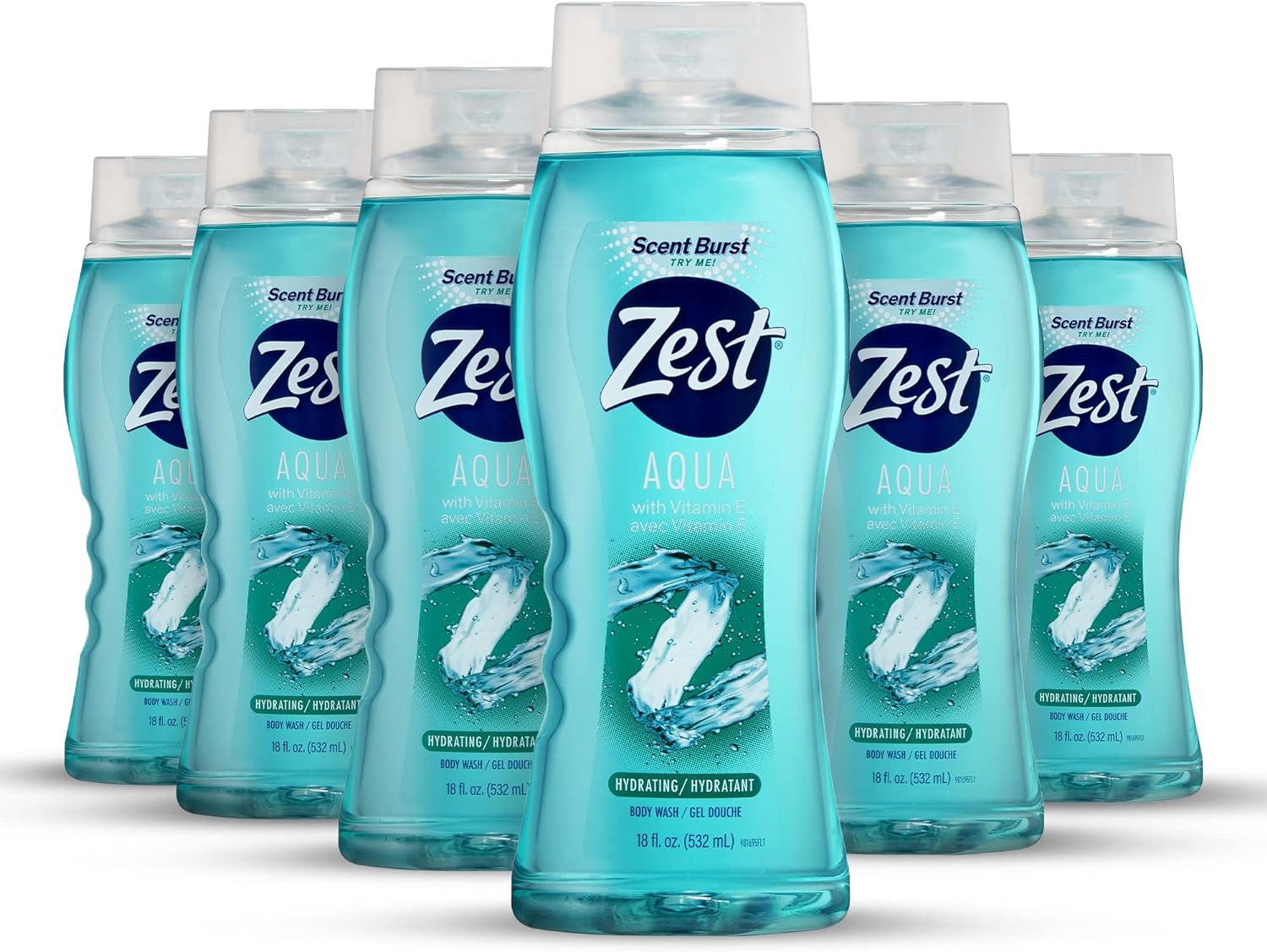 Zest Aqua Hydrating Body Wash, 18 Fl Oz (Pack of 6) - Moisturizing & Refreshing Shower Gel, Easily Lathers for a Relaxing Bubble Bath - Foaming & Exfoliating Skin Cleanser for a Smooth & Clean Skin